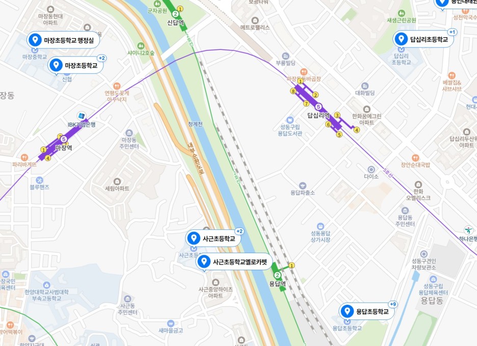 또한 교육 시설에 대한 접근성은 좋지 않습니다. 가장 가까운 답십리초등학교는 동대문구에 속해 배정 받기 어렵고, 마장초등학교로의 이동 경로가 복잡하며 거리적으로도 먼 편입니다. 용답초등학교까지의 거리도 상당히 멀기 때문에 초등학생의 통학에는 어려움이 예상됩니다. 학원가 접근성 역시 부족한 편입니다.