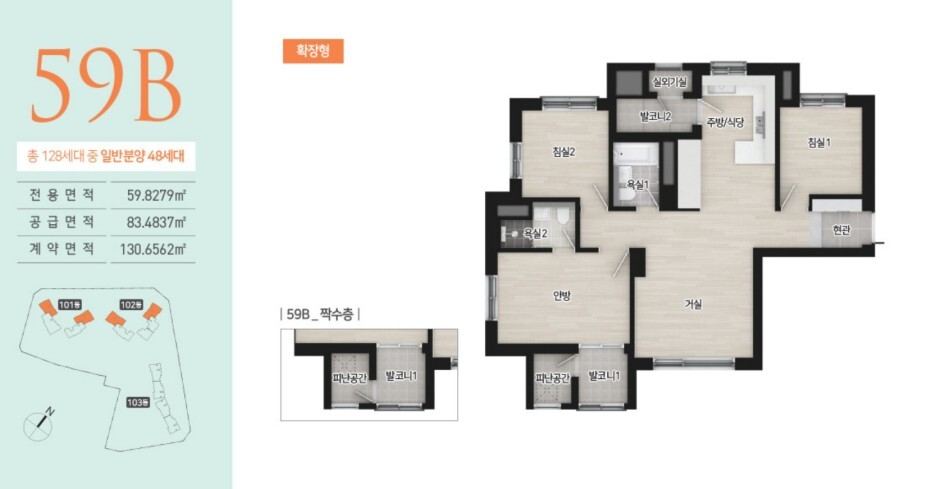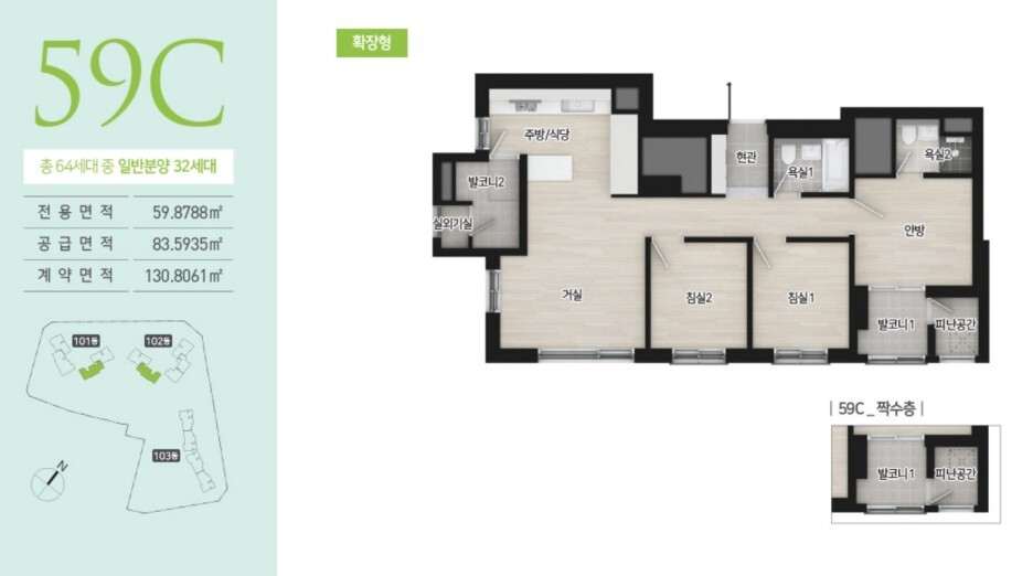 구체적으로 59㎡ 세대를 살펴보면, 전반적으로 무난한 판상형 구조를 갖추고 있고, 대부분의 세대에서 좋은 조망을 자랑합니다. 특히, 청계리버뷰자이 쪽으로는 일부가 가려질 수 있지만 대체로 남향으로 개방된 풍경을 보여줍니다. 다만, 확장 전 평면도를 살펴봐야 실제로 얼마나 넓은지 확실히 알 수 있을 것 같습니다.