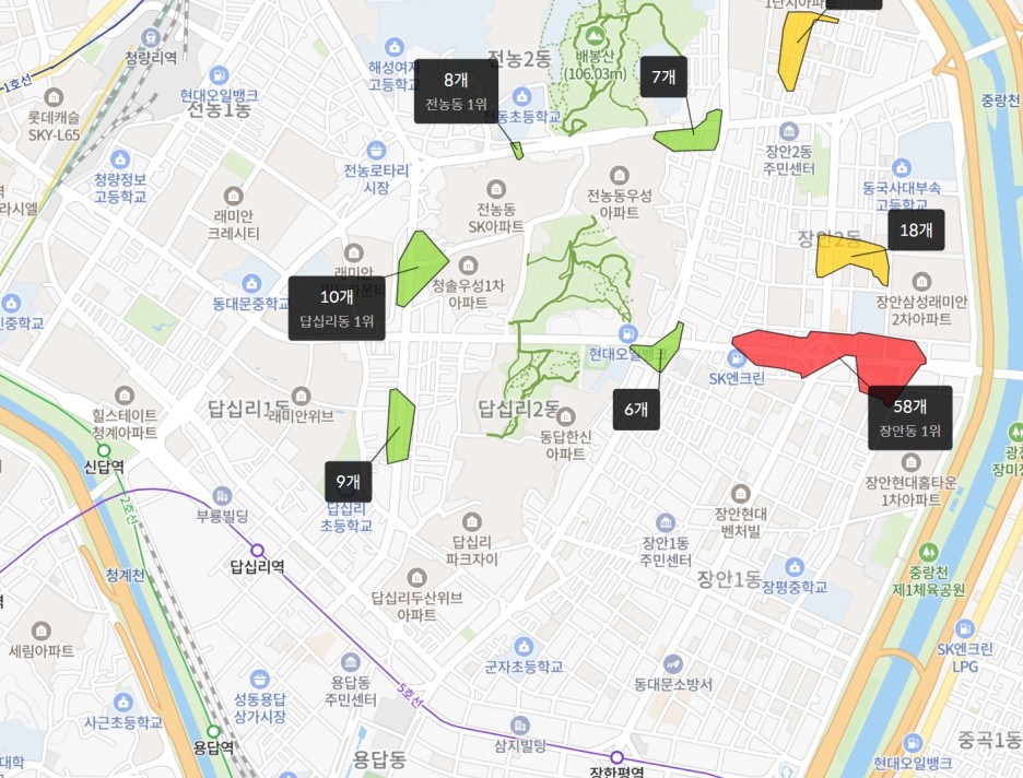또한 교육 시설에 대한 접근성은 좋지 않습니다. 가장 가까운 답십리초등학교는 동대문구에 속해 배정 받기 어렵고, 마장초등학교로의 이동 경로가 복잡하며 거리적으로도 먼 편입니다. 용답초등학교까지의 거리도 상당히 멀기 때문에 초등학생의 통학에는 어려움이 예상됩니다. 학원가 접근성 역시 부족한 편입니다.