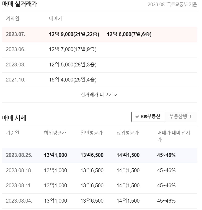 반면, 이와 비교하여 평균 매매가는 15억 4,143만원, KB시세는 16억 500만원입니다. 전세에 관한 정보로는, 2023년 6월 24일의 실거래가는 6억 2천만원, 평균 매물 가격은 6억 5천만원이며, KB시세는 7억 5,500만원으로 파악됩니다.