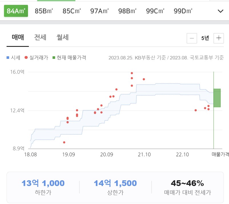 서울역센트럴자이의 매물가는 15억 5,000만원으로 이와 비슷한 수준을 보입니다. 모든 단지는 고점 대비 약 14.76% 가격이 떨어져 있습니다.