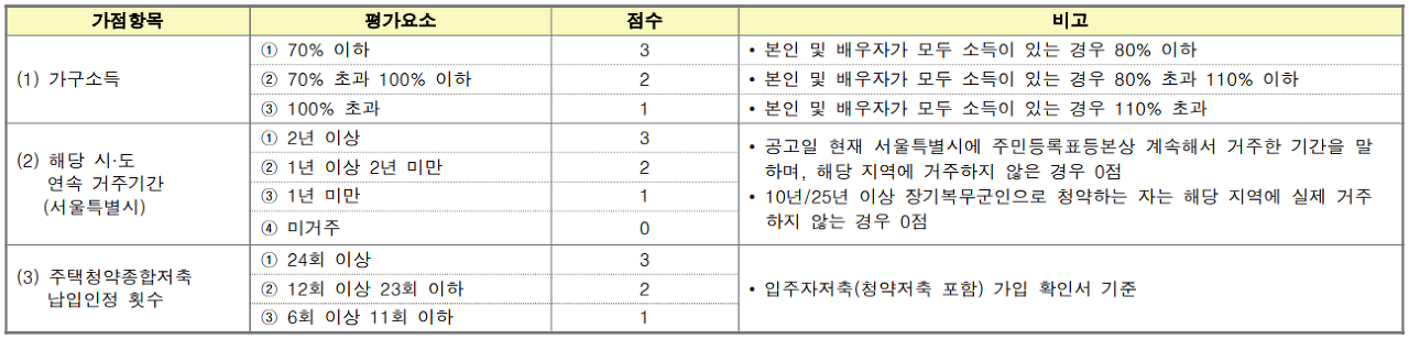 소득이 70% 이하, 서울시에 2년 이상 거주, 주택청약저축 24회 이상이면 각각 3점씩 얻을 수 있습니다. 이러한 점수제도는 사전청약 당시와 비교하면 큰 변화가 있는데, 그 중요한 변화는 전매제한과 거주의무 기간이 각각 10년, 5년에서 3년으로 크게 줄어들었다는 것입니다.