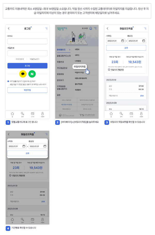- 마일리지는 카드사로부터 대중교통 이용내역 수신 후, 대중교통 이용금액 및 이동거리에 비례하여 최종 계산 후 적립됩니다.