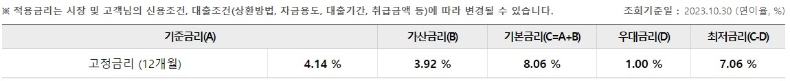 시장상황, 고객의 신용도, 은행의 정책 변동 등에 따라 기준금리, 가산금리 및 대출한도 등이 변경될 수 있습니다.