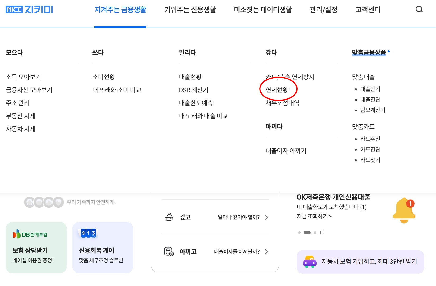 연체현황 조회: 로그인 후, 홈페이지의지켜주는 금융생활 섹션으로 이동한 다음 연체현황 메뉴를 선택합니다.