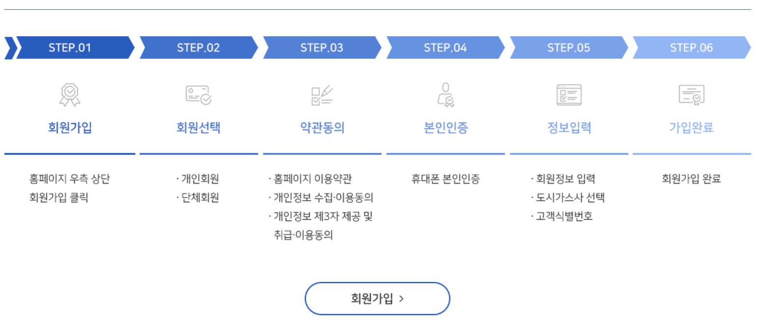 * 중앙난방 사용자 중 난방은 아파트 관리사무소 등에서 정산하고, 취사만 도시가스사에 납부하는 세대는 개인회원으로 신청불가(관리사무소, 입주자 대표회의 등에서 단체회원으로 신청 가능)