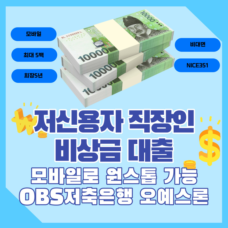 OBS저축은행의 '오예스론'은 저신용 직장인들을 위한 비상금대출 성격의 상품입니다. 무방문으로 실행되며, 대출한도 최고 5백만원에 대출기간 최장 5년입니다.
