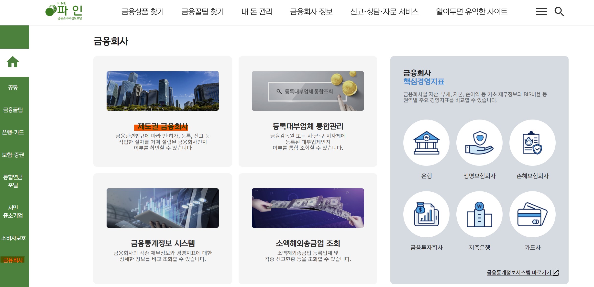 메인 화면의 오른쪽 하단에서 '금융회사' 항목 중 '제도권 금융회사 조회'를 선택합니다.