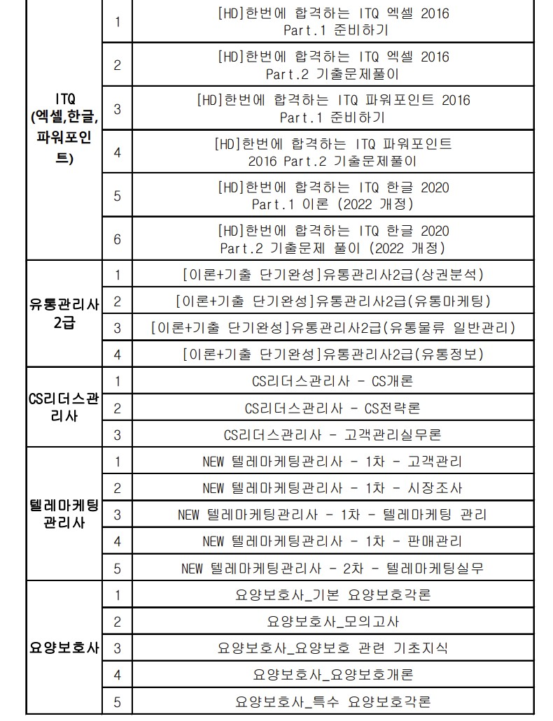 전산회계(1/2급), 전산세무(1/2급), 한국사능력시험 심화(1/2/3급), 컴퓨터활용능력(1/2급), 직업상담사2급, 워드프로세서, ITQ(한글,엑셀,파워포인트), 유통관리사2급, CS리더스관리사, 텔레마케팅관리사, 요양보호사