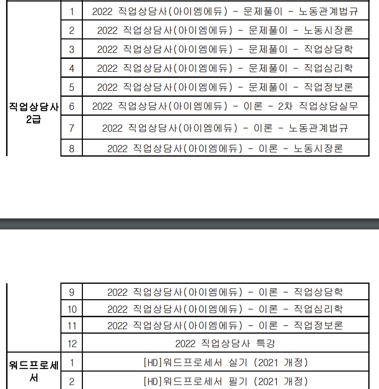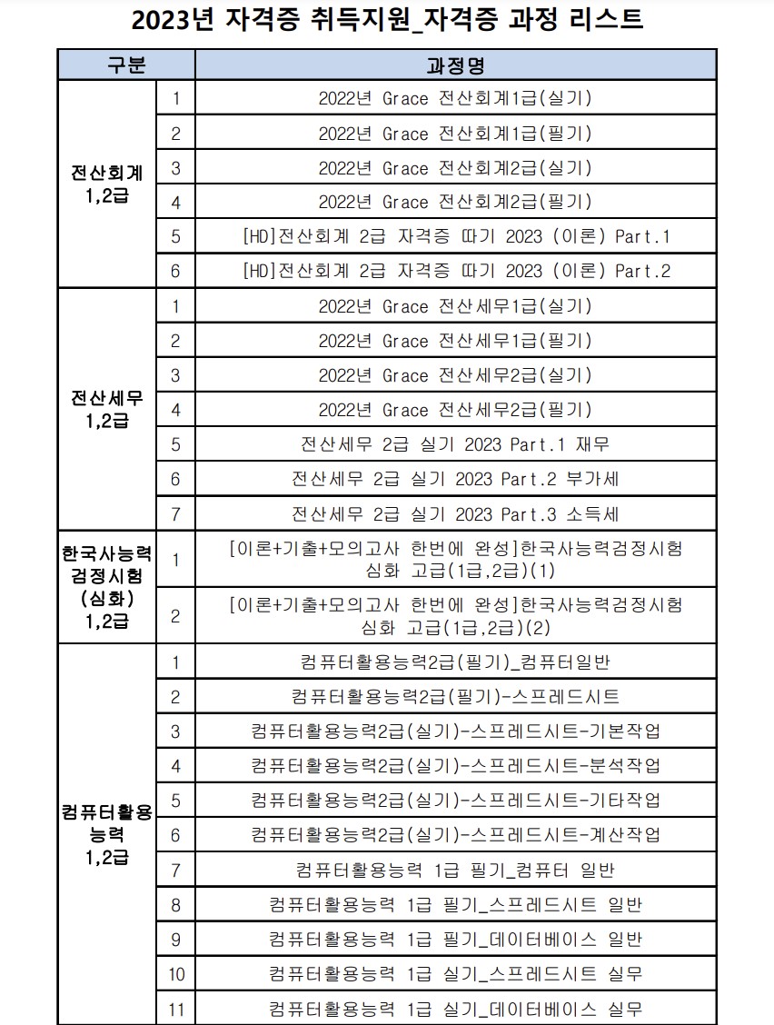 전산회계(1/2급), 전산세무(1/2급), 한국사능력시험 심화(1/2/3급), 컴퓨터활용능력(1/2급), 직업상담사2급, 워드프로세서, ITQ(한글,엑셀,파워포인트), 유통관리사2급, CS리더스관리사, 텔레마케팅관리사, 요양보호사